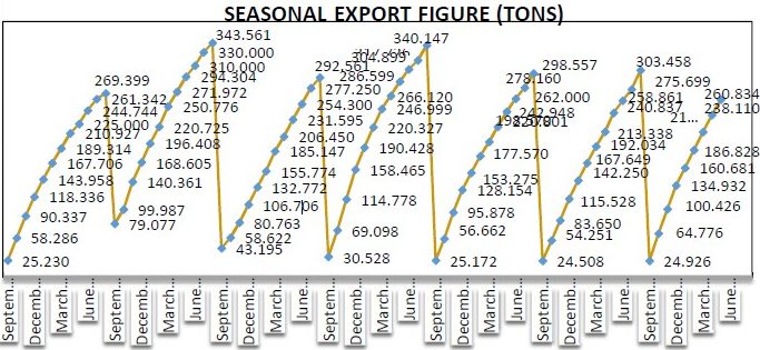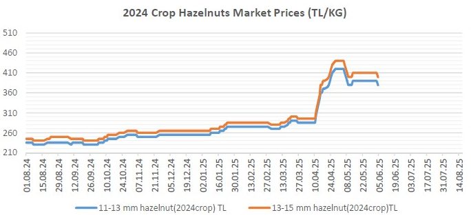 As of 01.06.2025, we exported 260.834,- tons of hazelnuts. In the 2023/2024 season, the same time export was 240.377 tons, in the 2022/2023 season same time export was 244.355.- tons, as can be seen in the graphic.