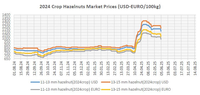 On 15.08.2024, crop 2024 prices for 11-13mm natural hazelnut kernels started at the level of 7.960 USD/tons (7.280 Euro/tons). Today, 11-13mm natural hazelnut kernel prices for DDU European deliveries are at 1.123 USD/ton (9.870 Euro/ton) levels.